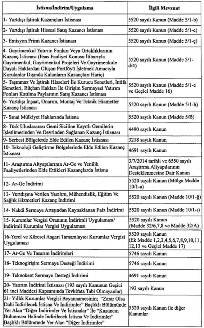 Tebliğin 7. ve izleyen maddeleri ile kurumlar vergisi mükelleflerinin, Kurumlar Vergisi Kanunu ve ilgili diğer mevzuat kapsamında gelir vergisi beyannamelerinde yer verilen istisna, indirim ve uygulamalara ilişkin aşağıdaki işlemlerini, yeminli mali müşavirlere tasdik ettirmeleri zorunluluğu getirilmiştir. Tasdik zorunluluğu getirilen istisna, indirim ve uygulamalar aşağıdaki gibidir: